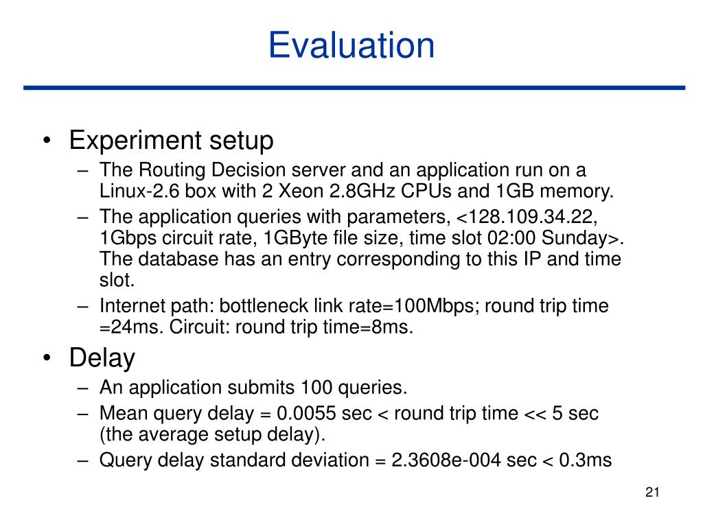Evaluation • Experiment setup • The Routing Decision server and an application run on a Linux-2.6 box with 2 Xeon 2.8GHz CPUs and 1GB memory. • The application queries with parameters, <128.109.34.22, 1Gbps circuit rate, 1GByte file size, time slot 02:00 Sunday>. The database has an entry corresponding to this IP and time slot. • Internet path: bottleneck link rate=100Mbps; round trip time=24ms.Circuit: round trip time=8ms. • Delay • An application submits 100 queries. • Mean query delay = 0.0055 sec < round trip time << 5 sec (the average setup delay). • Query delay standard deviation = 2.3608e-004 sec < 0.3ms