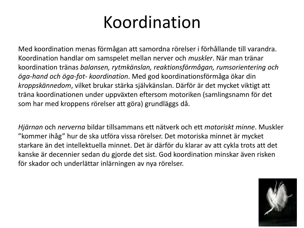 Koordination Med koordination menas förmågan att samordna rörelser i förhållande till varandra. Koordination handlar om samspelet mellan nerver och muskler. När man tränar koordination tränas balansen, rytmkänslan, reaktionsförmågan, rumsorientering och öga-hand och öga-fot- koordination. Med god koordinationsförmåga ökar din kroppskännedom, vilket brukar stärka självkänslan. Därför är det mycket viktigt att träna koordinationen under uppväxten eftersom motoriken (samlingsnamn för det som har med kroppens rörelser att göra) grundläggs då. Hjärnan och nerverna bildar tillsammans ett nätverk och ett motoriskt minne. Muskler ”kommer ihåg” hur de ska utföra vissa rörelser. Det motoriska minnet är mycket starkare än det intellektuella minnet. Det är därför du klarar av att cykla trots att det kanske är decennier sedan du gjorde det sist. God koordination minskar även risken för skador och underlättar inlärningen av nya rörelser.