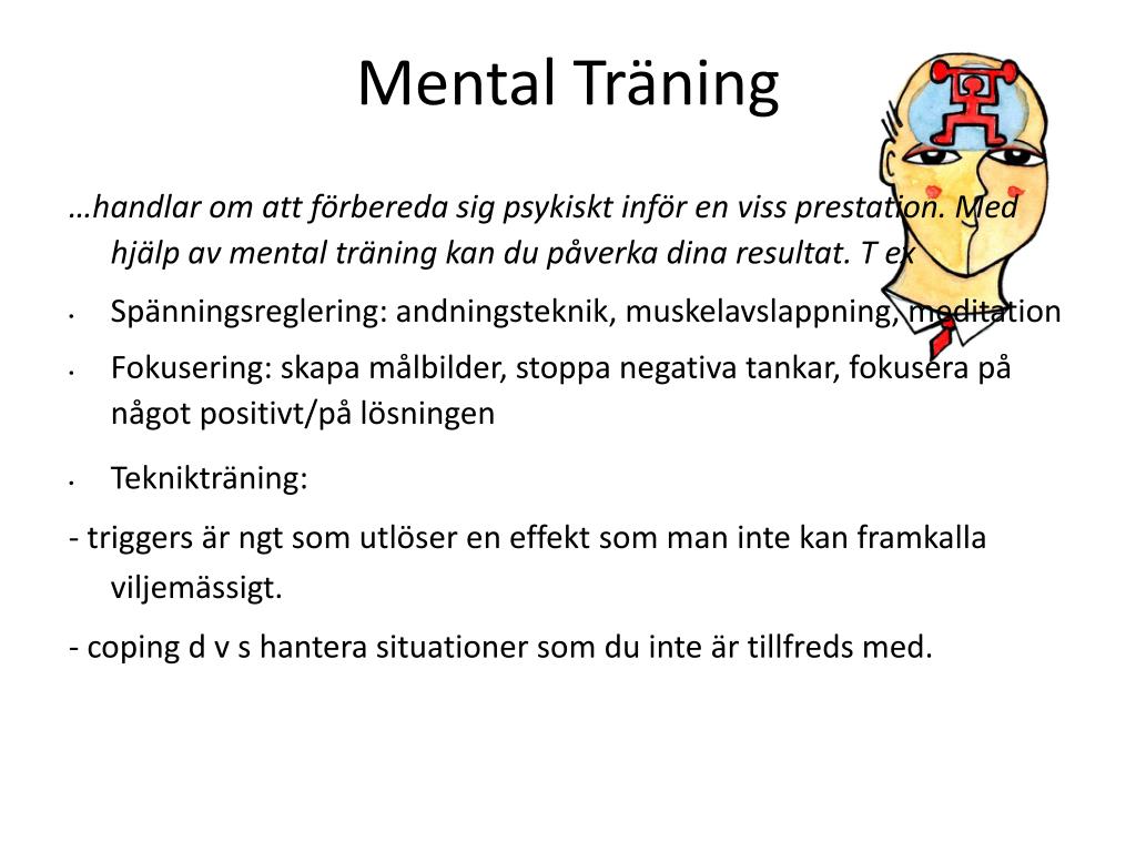 Mental Träning …handlar om att förbereda sig psykiskt inför en viss prestation. Med hjälp av mental träning kan du påverka dina resultat. T ex • Spänningsreglering: andningsteknik, muskelavslappning, meditation • Fokusering: skapa målbilder, stoppa negativa tankar, fokusera på något positivt/på lösningen • Teknikträning: - triggers är ngt som utlöser en effekt som man inte kan framkalla viljemässigt. - coping d v s hantera situationer som du inte är tillfreds med.