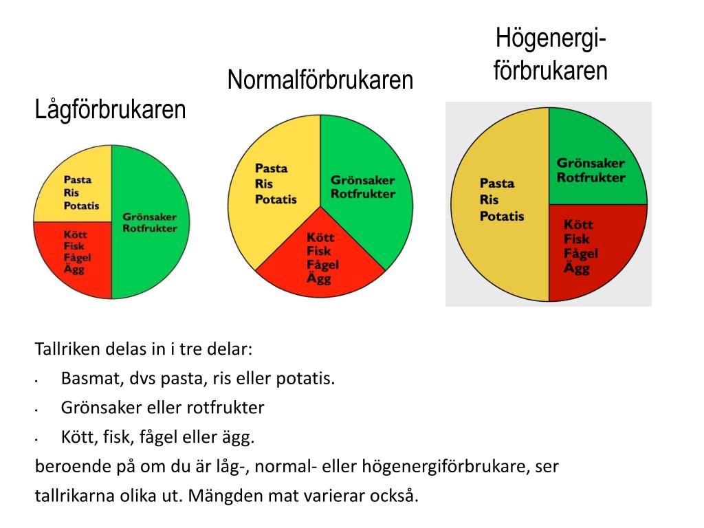 Högenergi-förbrukaren Normalförbrukaren Lågförbrukaren Tallriken delas in i tre delar: • Basmat, dvs pasta, ris eller potatis. • Grönsaker eller rotfrukter • Kött, fisk, fågel eller ägg. beroende på om du är låg-, normal- eller högenergiförbrukare, ser tallrikarna olika ut. Mängden mat varierar också.