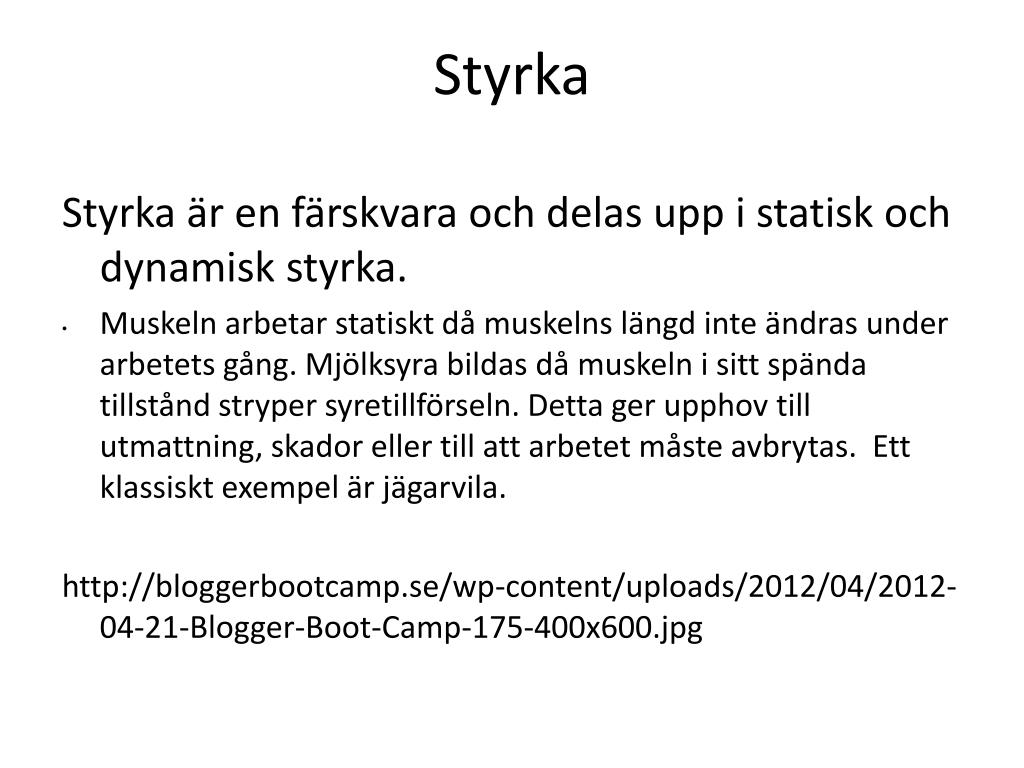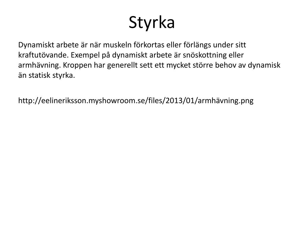 Styrka Dynamiskt arbete är när muskeln förkortas eller förlängs under sitt kraftutövande. Exempel på dynamiskt arbete är snöskottning eller armhävning. Kroppen har generellt sett ett mycket större behov av dynamisk än statisk styrka. http://eelineriksson.myshowroom.se/files/2013/01/armhävning.png