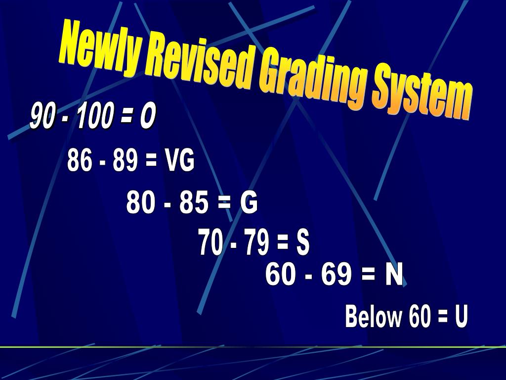 Newly Revised Grading System 90 - 100 = O 86 - 89 = VG 80 - 85 = G 70 - 79 = S 60 - 69 = N Below 60 = U