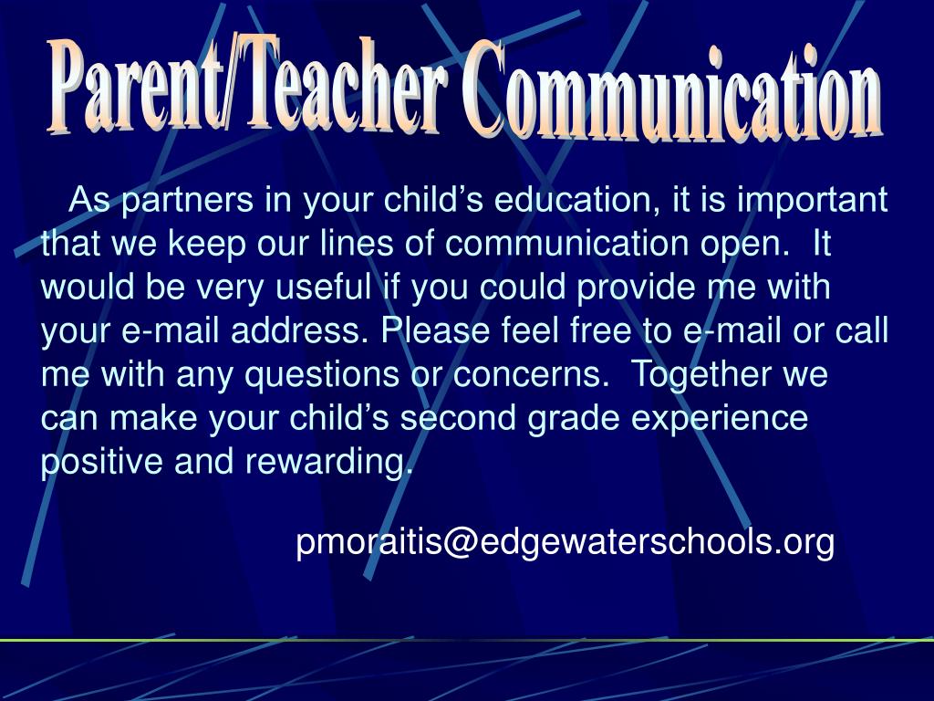 Parent/Teacher Communication As partners in your child’s education, it is important that we keep our lines of communication open. It would be very useful if you could provide me with your e-mail address. Please feel free to e-mail or call me with any questions or concerns. Together we can make your child’s second grade experience positive and rewarding. pmoraitis@edgewaterschools.org