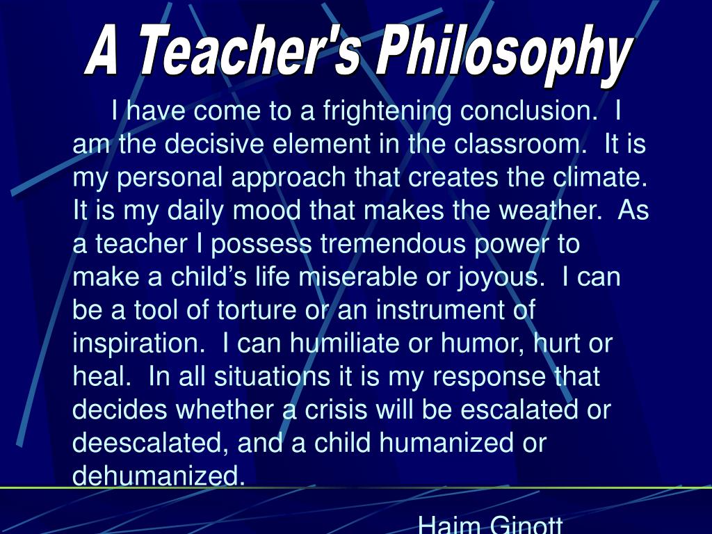 A Teacher's Philosophy I have come to a frightening conclusion. I am the decisive element in the classroom. It is my personal approach that creates the climate. It is my daily mood that makes the weather. As a teacher I possess tremendous power to make a child’s life miserable or joyous. I can be a tool of torture or an instrument of inspiration. I can humiliate or humor, hurt or heal. In all situations it is my response that decides whether a crisis will be escalated or deescalated, and a child humanized or dehumanized. Haim Ginott