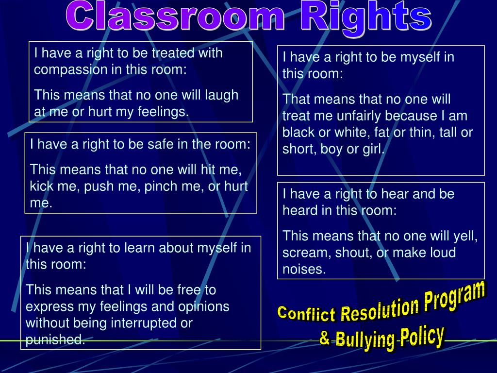 Classroom Rights I have a right to be treated with compassion in this room: This means that no one will laugh at me or hurt my feelings. I have a right to be myself in this room: That means that no one will treat me unfairly because I am black or white, fat or thin, tall or short, boy or girl. I have a right to be safe in the room: This means that no one will hit me, kick me, push me, pinch me, or hurt me. I have a right to hear and be heard in this room: This means that no one will yell, scream, shout, or make loud noises. I have a right to learn about myself in this room: This means that I will be free to express my feelings and opinions without being interrupted or punished. Conflict Resolution Program & Bullying Policy