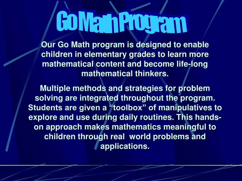 Go Math Program Our Go Math program is designed to enable children in elementary grades to learn more mathematical content and become life-long mathematical thinkers. Multiple methods and strategies for problem solving are integrated throughout the program. Students are given a “toolbox” of manipulatives to explore and use during daily routines. This hands-on approach makes mathematics meaningful to children through real world problems and applications.
