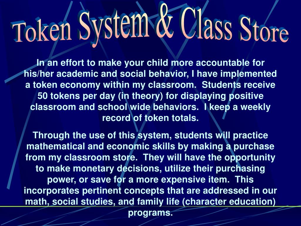 Token System & Class Store In an effort to make your child more accountable for his/her academic and social behavior, I have implemented a token economy within my classroom. Students receive 50 tokens per day (in theory) for displaying positive classroom and school wide behaviors. I keep a weekly record of token totals. Through the use of this system, students will practice mathematical and economic skills by making a purchase from my classroom store. They will have the opportunity to make monetary decisions, utilize their purchasing power, or save for a more expensive item. This incorporates pertinent concepts that are addressed in our math, social studies, and family life (character education) programs.