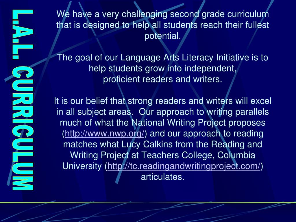 We have a very challenging second grade curriculum that is designed to help all students reach their fullest potential. The goal of our Language Arts Literacy Initiative is to help students grow into independent, proficient readers and writers. It is our belief that strong readers and writers will excel in all subject areas. Our approach to writing parallels much of what the National Writing Project proposes (http://www.nwp.org/) and our approach to reading matches what Lucy Calkins from the Reading and Writing Project at Teachers College, Columbia University (http://tc.readingandwritingproject.com/) articulates. L.A.L. CURRICULUM