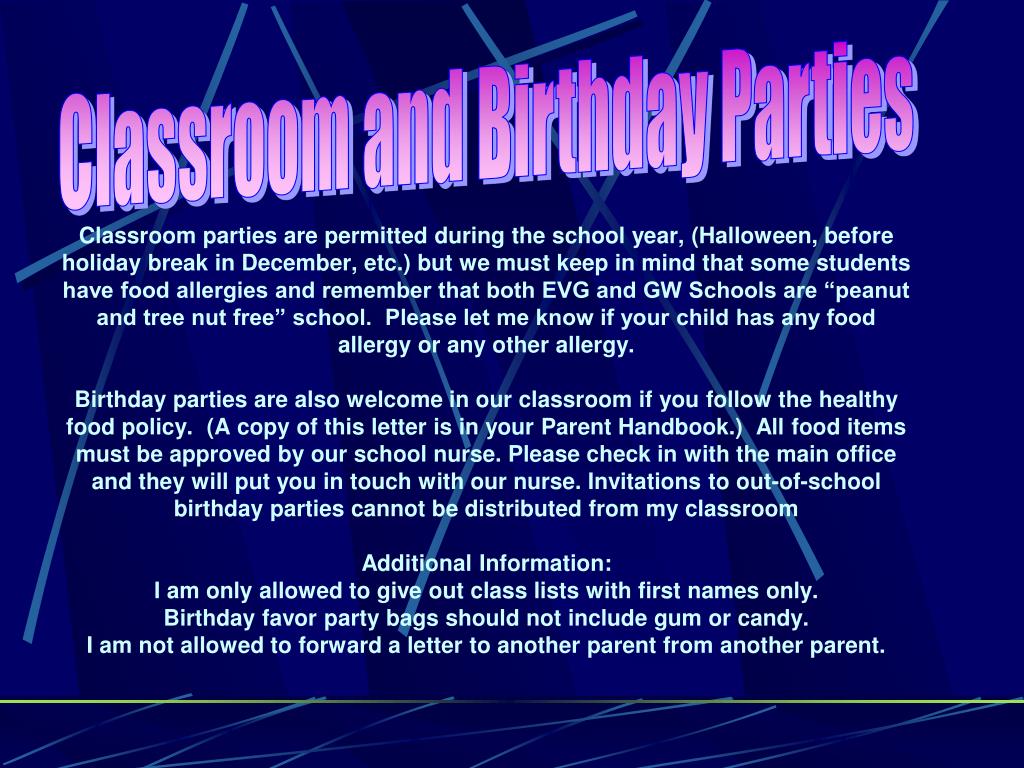 Classroom and Birthday Parties Classroom parties are permitted during the school year, (Halloween, before holiday break in December, etc.) but we must keep in mind that some students have food allergies and remember that both EVG and GW Schools are “peanut and tree nut free” school. Please let me know if your child has any food allergy or any other allergy.Birthday parties are also welcome in our classroom if you follow the healthy food policy. (A copy of this letter is in your Parent Handbook.) All food items must be approved by our school nurse. Please check in with the main office and they will put you in touch with our nurse. Invitations to out-of-school birthday parties cannot be distributed from my classroomAdditional Information:I am only allowed to give out class lists with first names only.Birthday favor party bags should not include gum or candy. I am not allowed to forward a letter to another parent from another parent.