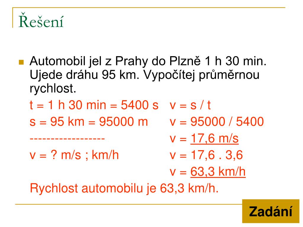 Řešení • Automobil jel z Prahy do Plzně 1 h 30 min. Ujede dráhu 95 km. Vypočítej průměrnou rychlost. t = 1 h 30 min = 5400 s v = s / t s = 95 km = 95000 m v = 95000 / 5400 ------------------ v = 17,6 m/s v = ? m/s ; km/h v = 17,6 . 3,6 v = 63,3 km/h Rychlost automobilu je 63,3 km/h. Zadání