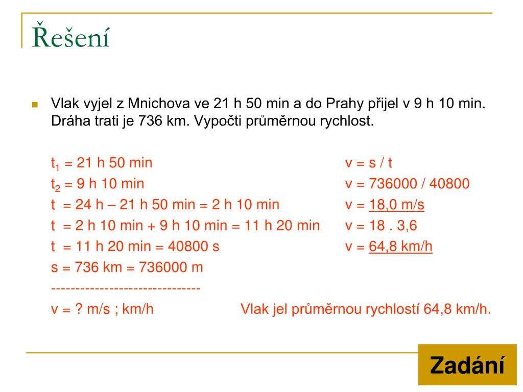 Příklady - rychlost • Automobil jel z Prahy do Plzně 1 h 30 min. Ujede dráhu 95 km. Vypočítej průměrnou rychlost. • Vlak vyjel z Mnichova ve 21 h 50 min a do Prahy přijel v 9 h 10 min. Dráha trati je 736 km. Vypočti průměrnou rychlost. Řešení Řešení