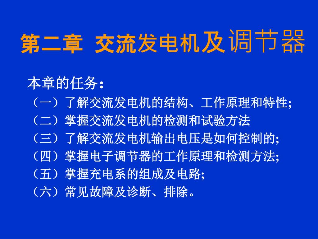 第二章 交流发电机及调节器 本章的任务: (一)了解交流发电机的结构、工作原理和特性; (二)掌握交流发电机的检测和试验方法 (三)了解交流发电机输出电压是如何控制的; (四)掌握电子调节器的工作原理和检测方法; (五)掌握充电系的组成及电路; (六)常见故障及诊断、排除。