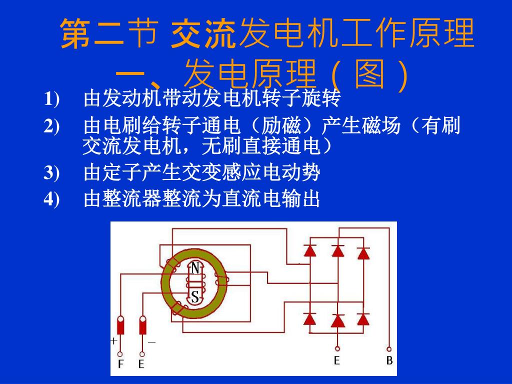 第二节 交流发电机工作原理一、发电原理(图) • 由发动机带动发电机转子旋转 • 由电刷给转子通电(励磁)产生磁场(有刷交流发电机,无刷直接通电) • 由定子产生交变感应电动势 • 由整流器整流为直流电输出