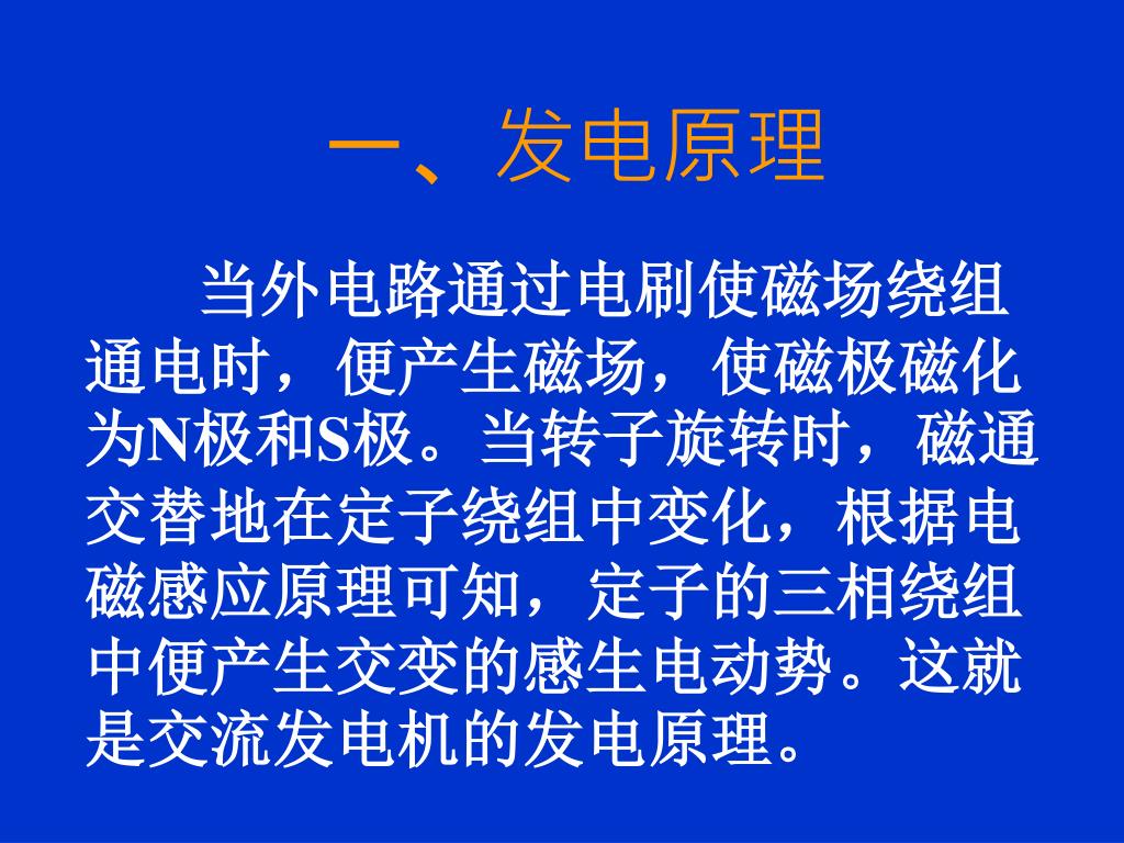 一、发电原理 当外电路通过电刷使磁场绕组通电时,便产生磁场,使磁极磁化为N极和S极。当转子旋转时,磁通交替地在定子绕组中变化,根据电磁感应原理可知,定子的三相绕组中便产生交变的感生电动势。这就是交流发电机的发电原理。
