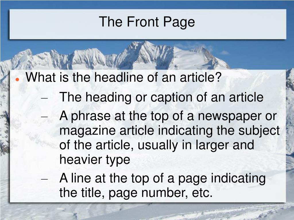 The Front Page • What is the headline of an article? • The heading or caption of an article • A phrase at the top of a newspaper or magazine article indicating the subject of the article, usually in larger and heavier type • A line at the top of a page indicating the title, page number, etc.