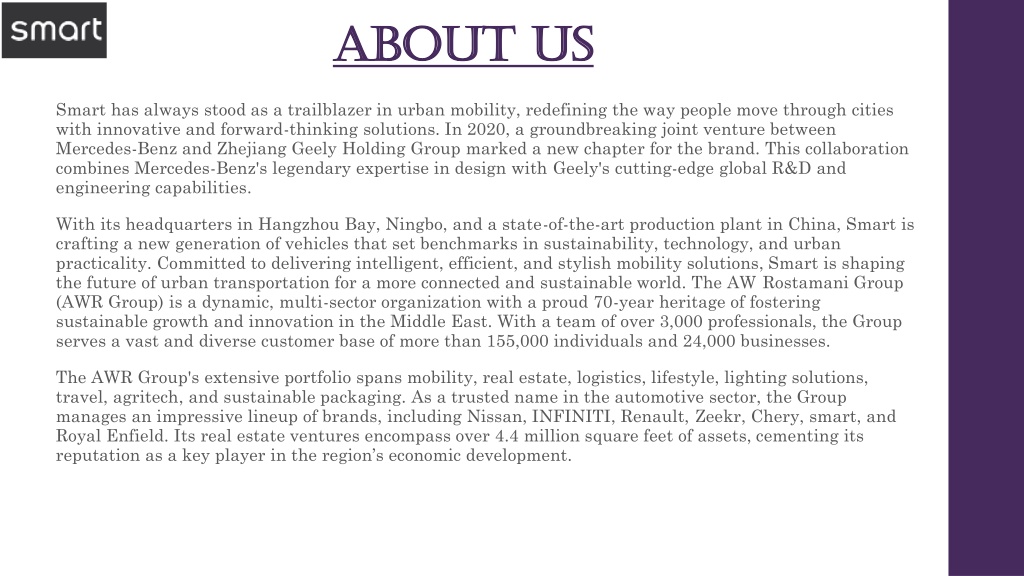 ABOUT us Smart has always stood as a trailblazer in urban mobility, redefining the way people move through cities with innovative and forward-thinking solutions. In 2020, a groundbreaking joint venture between Mercedes-Benz and Zhejiang Geely Holding Group marked a new chapter for the brand. This collaboration combines Mercedes-Benz's legendary expertise in design with Geely's cutting-edge global R&D and engineering capabilities. With its headquarters in Hangzhou Bay, Ningbo, and a state-of-the-art production plant in China, Smart is crafting a new generation of vehicles that set benchmarks in sustainability, technology, and urban practicality. Committed to delivering intelligent, efficient, and stylish mobility solutions, Smart is shaping the future of urban transportation for a more connected and sustainable world. The AW Rostamani Group (AWR Group) is a dynamic, multi-sector organization with a proud 70-year heritage of fostering sustainable growth and innovation in the Middle East. With a team of over 3,000 professionals, the Group serves a vast and diverse customer base of more than 155,000 individuals and 24,000 businesses. The AWR Group's extensive portfolio spans mobility, real estate, logistics, lifestyle, lighting solutions, travel, agritech, and sustainable packaging. As a trusted name in the automotive sector, the Group manages an impressive lineup of brands, including Nissan, INFINITI, Renault, Zeekr, Chery, smart, and Royal Enfield. Its real estate ventures encompass over 4.4 million square feet of assets, cementing its reputation as a key player in the region’s economic development.