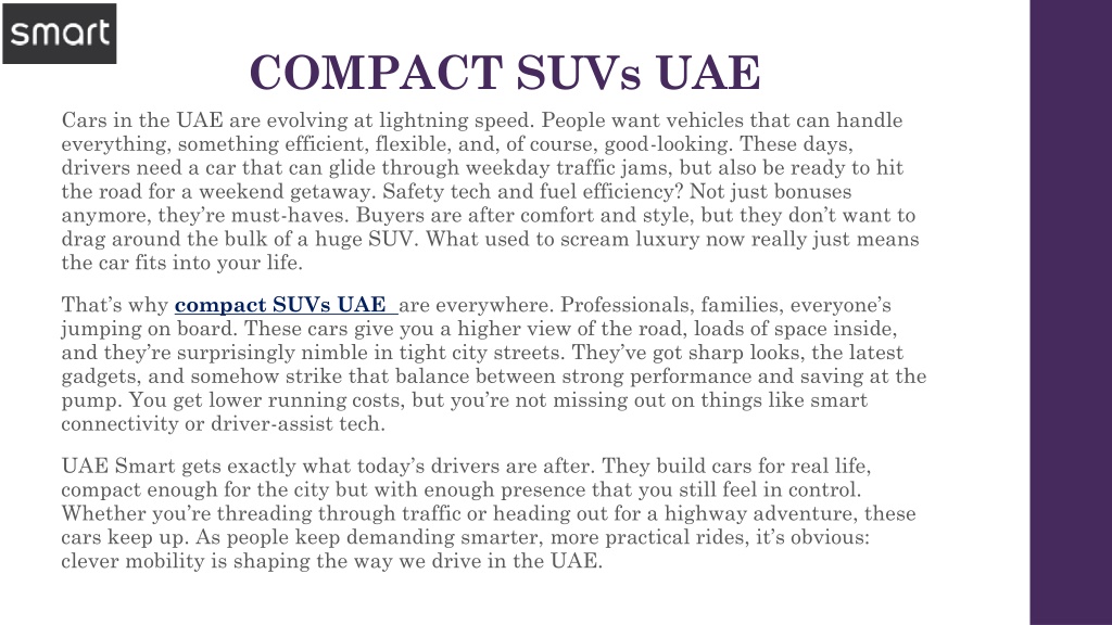 COMPACT SUVs UAE Cars in the UAE are evolving at lightning speed. People want vehicles that can handle everything, something efficient, flexible, and, of course, good-looking. These days, drivers need a car that can glide through weekday traffic jams, but also be ready to hit the road for a weekend getaway. Safety tech and fuel efficiency? Not just bonuses anymore, they’re must-haves. Buyers are after comfort and style, but they don’t want to drag around the bulk of a huge SUV. What used to scream luxury now really just means the car fits into your life. That’s why compact SUVs UAE are everywhere. Professionals, families, everyone’s jumping on board. These cars give you a higher view of the road, loads of space inside, and they’re surprisingly nimble in tight city streets. They’ve got sharp looks, the latest gadgets, and somehow strike that balance between strong performance and saving at the pump. You get lower running costs, but you’re not missing out on things like smart connectivity or driver-assist tech. UAE Smart gets exactly what today’s drivers are after. They build cars for real life, compact enough for the city but with enough presence that you still feel in control. Whether you’re threading through traffic or heading out for a highway adventure, these cars keep up. As people keep demanding smarter, more practical rides, it’s obvious: clever mobility is shaping the way we drive in the UAE.