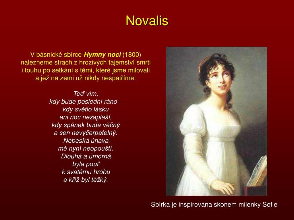 Novalis V básnické sbírce Hymny noci (1800) nalezneme strach z hrozivých tajemství smrti i touhu po setkání s těmi, které jsme milovali a jež na zemi už nikdy nespatříme: Teď vím, kdy bude poslední ráno – kdy světlo lásku ani noc nezaplaší, kdy spánek bude věčný a sen nevyčerpatelný. Nebeská únava mě nyní neopouští. Dlouhá a úmorná byla pouť k svatému hrobu a kříž byl těžký. Sbírka je inspirována skonem milenky Sofie