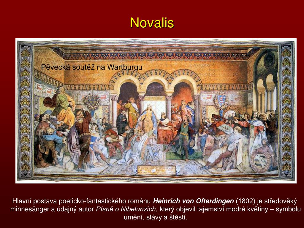 Novalis Pěvecká soutěž na Wartburgu Hlavní postava poeticko-fantastického románu Heinrich von Ofterdingen (1802) je středověký minnesänger a údajný autor Písně o Nibelunzích, který objevil tajemství modré květiny – symbolu umění, slávy a štěstí.