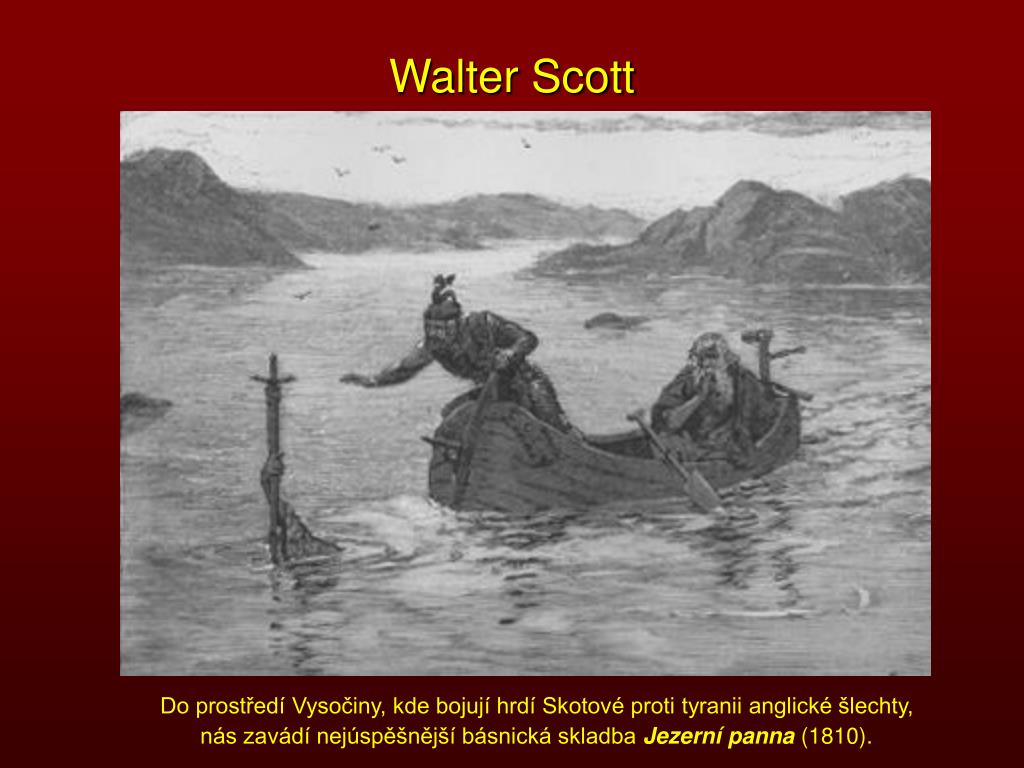 Walter Scott Do prostředí Vysočiny, kde bojují hrdí Skotové proti tyranii anglické šlechty, nás zavádí nejúspěšnější básnická skladba Jezerní panna (1810).