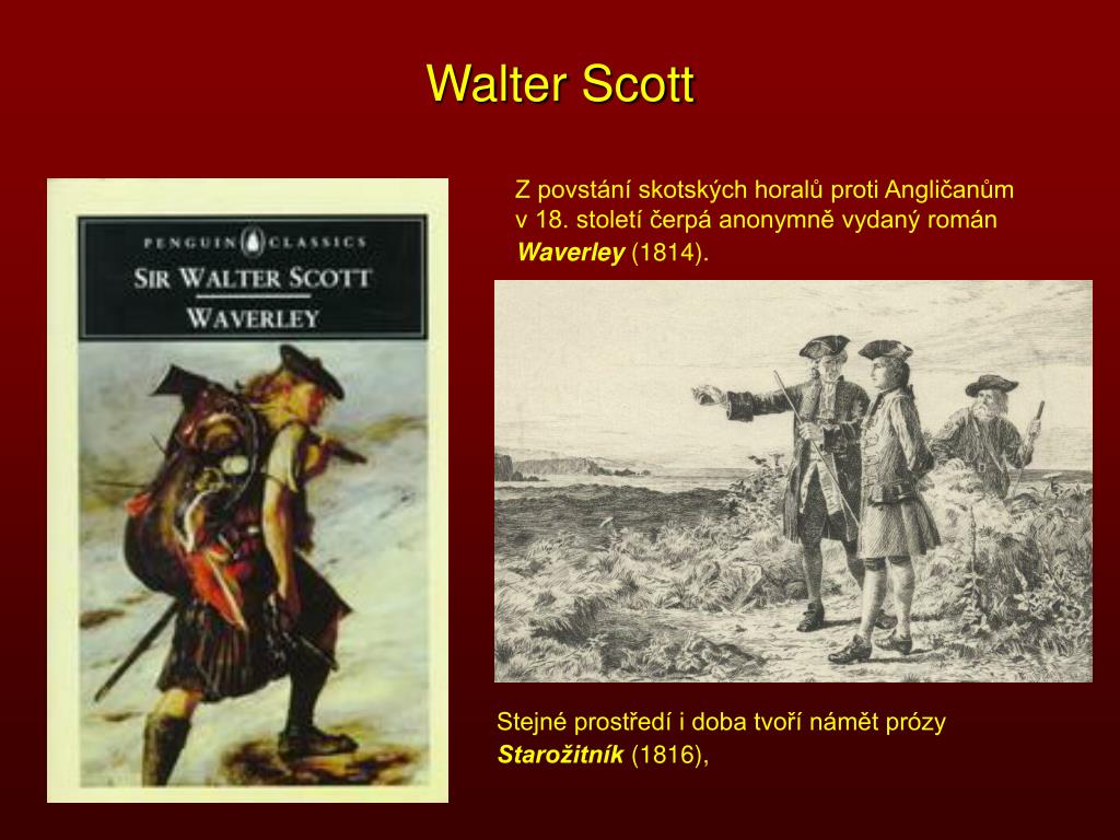 Walter Scott Z povstání skotských horalů proti Angličanům v 18. století čerpá anonymně vydaný román Waverley (1814). Stejné prostředí i doba tvoří námět prózy Starožitník (1816),