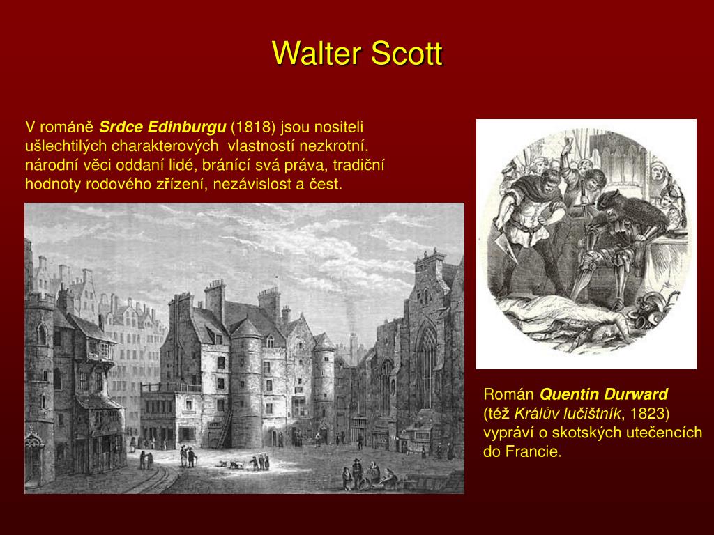 Walter Scott V románě Srdce Edinburgu (1818) jsou nositeli ušlechtilých charakterových vlastností nezkrotní, národní věci oddaní lidé, bránící svá práva, tradiční hodnoty rodového zřízení, nezávislost a čest. Román Quentin Durward (též Králův lučištník, 1823) vypráví o skotských utečencích do Francie.