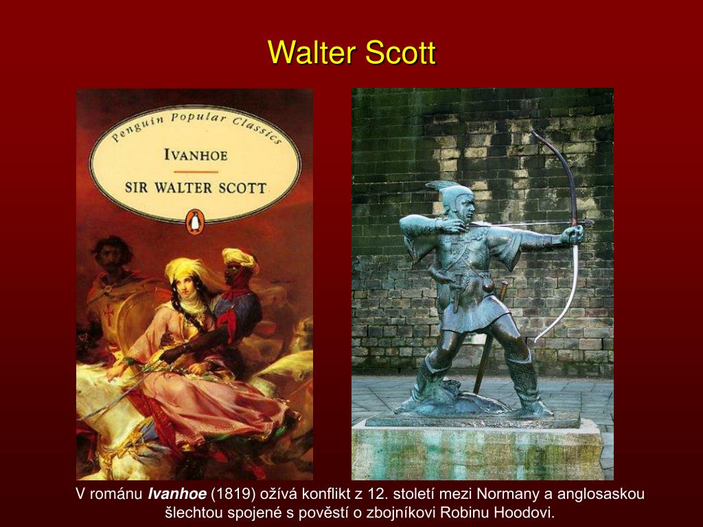 Walter Scott V románu Ivanhoe (1819) ožívá konflikt z 12. století mezi Normany a anglosaskou šlechtou spojené s pověstí o zbojníkovi Robinu Hoodovi.