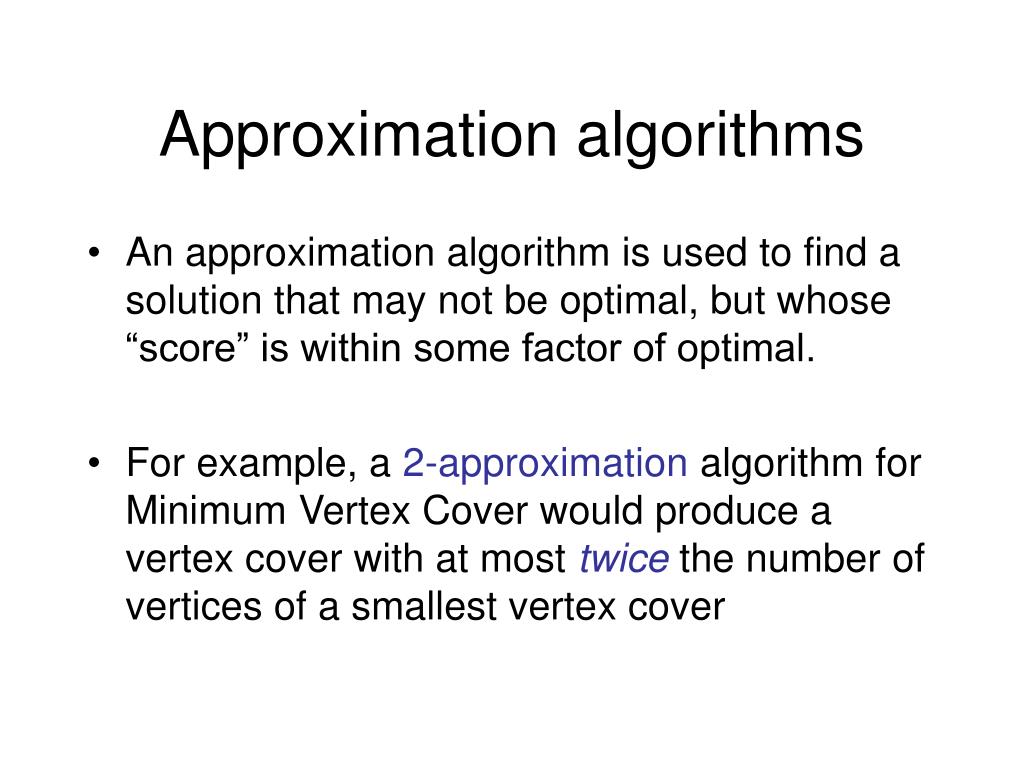 Approximation algorithms • An approximation algorithm is used to find a solution that may not be optimal, but whose “score” is within some factor of optimal. • For example, a 2-approximation algorithm for Minimum Vertex Cover would produce a vertex cover with at most twice the number of vertices of a smallest vertex cover