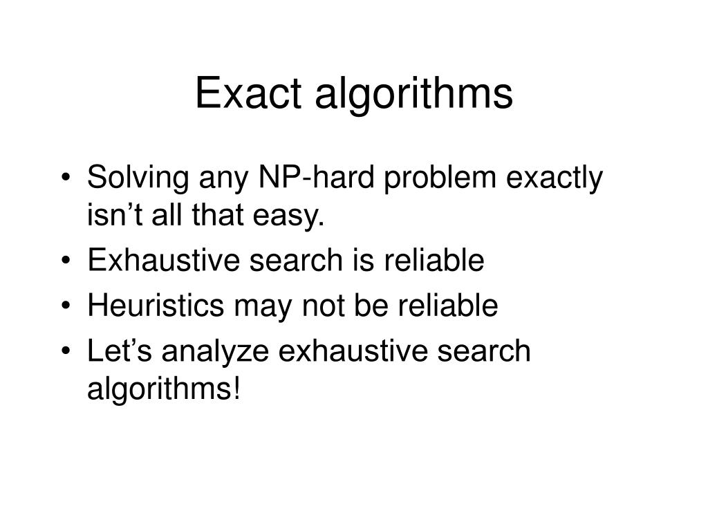 Exact algorithms • Solving any NP-hard problem exactly isn’t all that easy. • Exhaustive search is reliable • Heuristics may not be reliable • Let’s analyze exhaustive search algorithms!