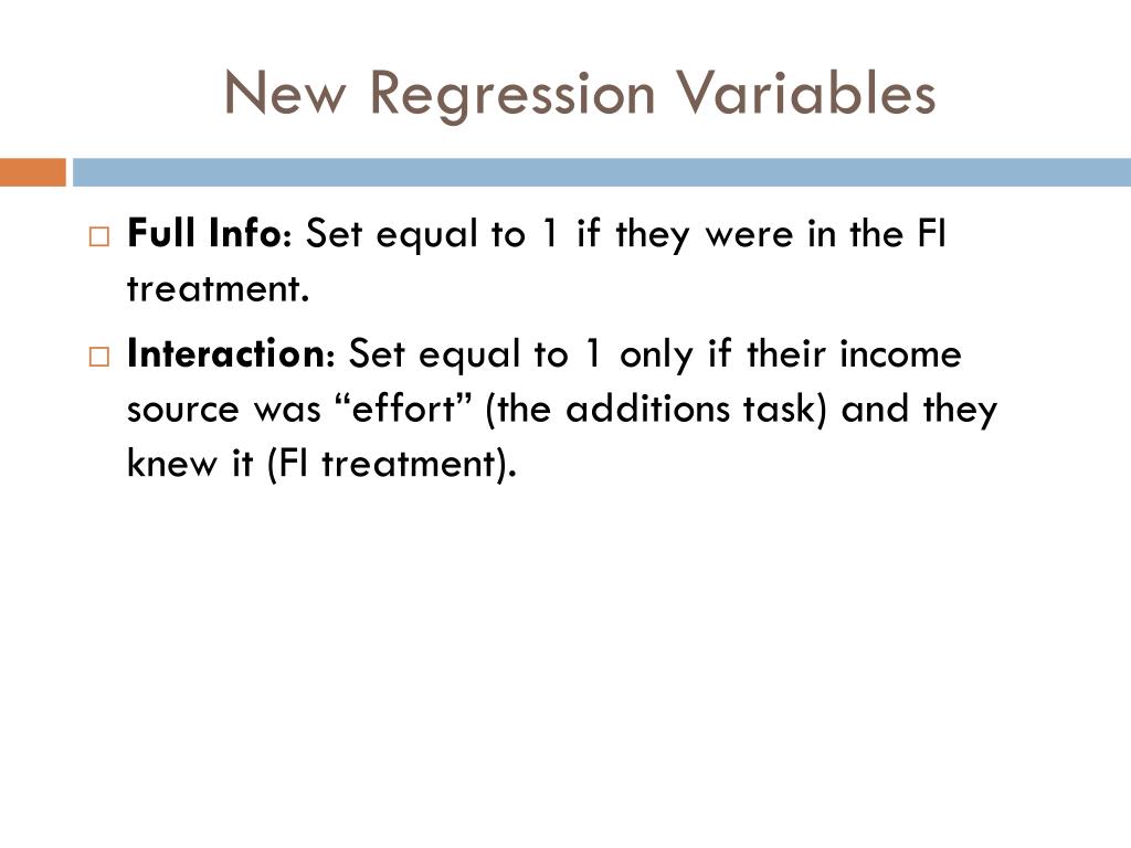 New Regression Variables Full Info: Set equal to 1 if they were in the FI treatment. Interaction: Set equal to 1 only if their income source was “effort” (the additions task) and they knew it (FI treatment).