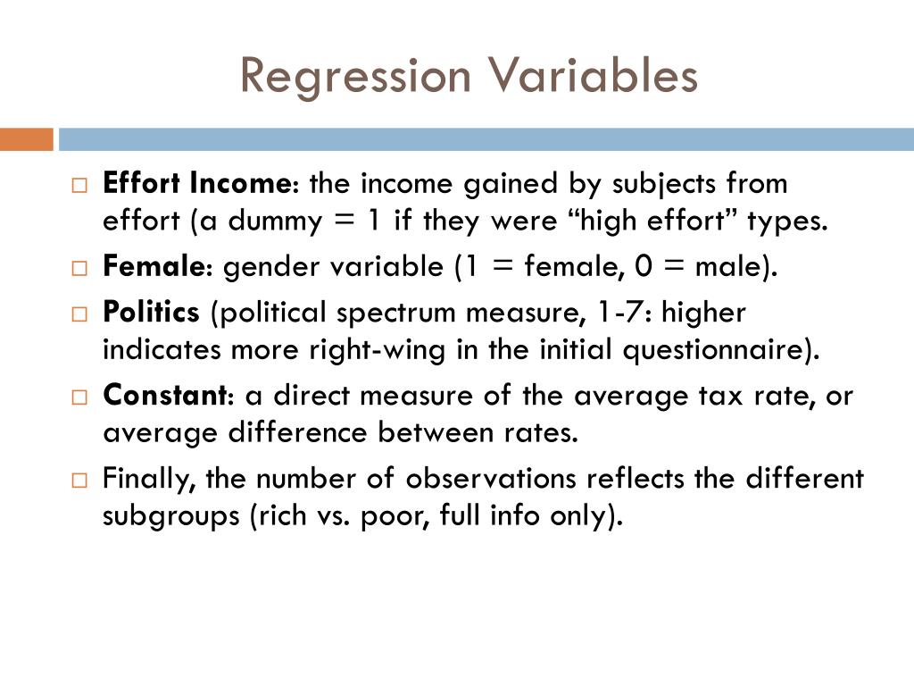Regression Variables Effort Income: the income gained by subjects from effort (a dummy = 1 if they were “high effort” types. Female: gender variable (1 = female, 0 = male). Politics (political spectrum measure, 1-7: higher indicates more right-wing in the initial questionnaire). Constant: a direct measure of the average tax rate, or average difference between rates. Finally, the number of observations reflects the different subgroups (rich vs. poor, full info only).