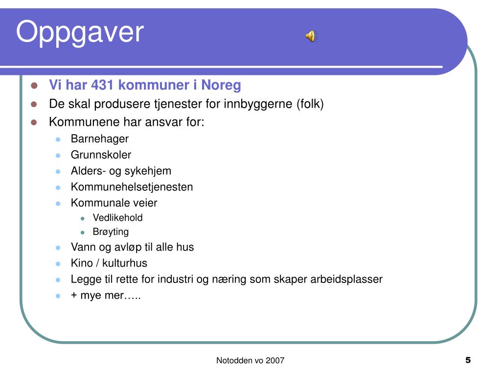 Oppgaver • Vi har 431 kommuner i Noreg • De skal produsere tjenester for innbyggerne (folk) • Kommunene har ansvar for: • Barnehager • Grunnskoler • Alders- og sykehjem • Kommunehelsetjenesten • Kommunale veier • Vedlikehold • Brøyting • Vann og avløp til alle hus • Kino / kulturhus • Legge til rette for industri og næring som skaper arbeidsplasser • + mye mer….. Notodden vo 2007