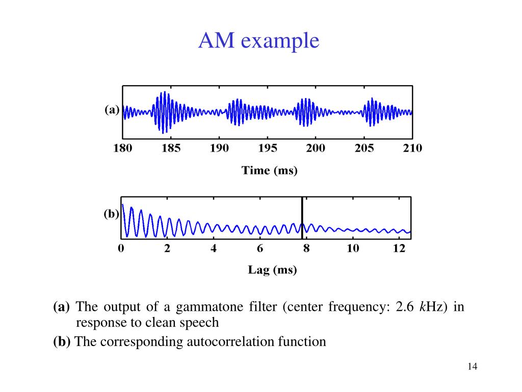 AM example (a) The output of a gammatone filter (center frequency:2.6 kHz) in response to clean speech (b) The corresponding autocorrelation function