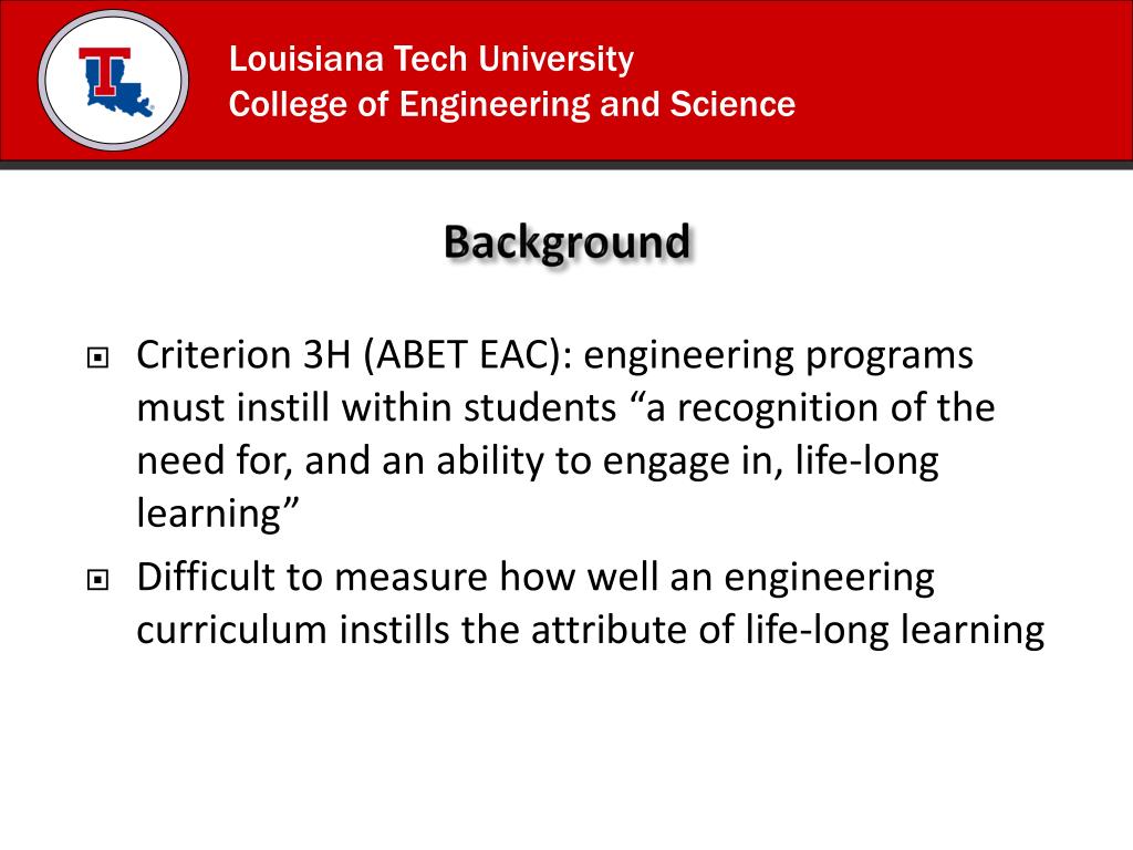 Background • Criterion 3H (ABET EAC): engineering programs must instill within students “a recognition of the need for, and an ability to engage in, life-long learning” • Difficult to measure how well an engineering curriculum instills the attribute of life-long learning