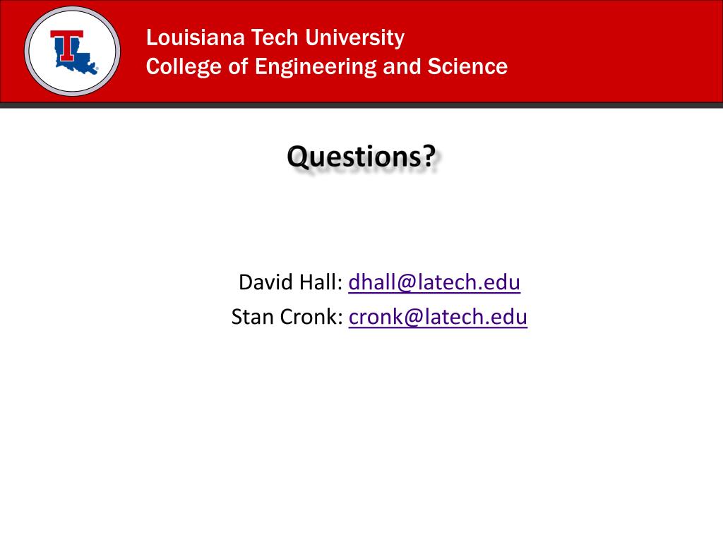 Questions? David Hall:dhall@latech.edu Stan Cronk: cronk@latech.edu