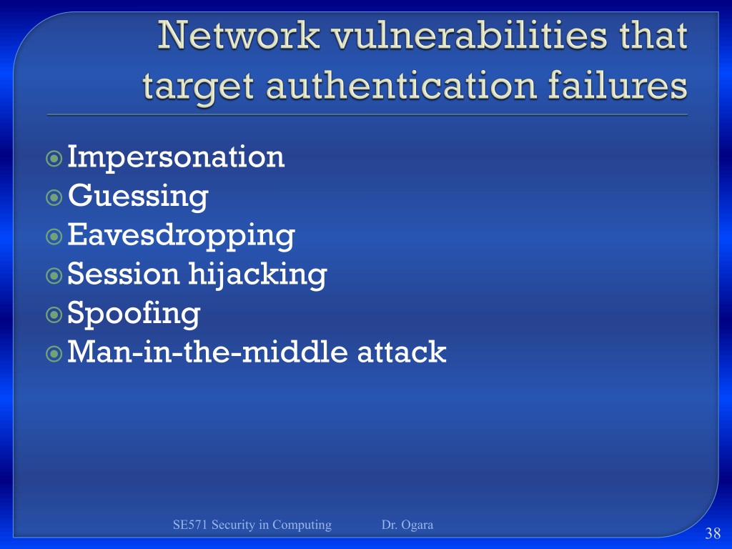Network vulnerabilities that target authentication failures • Impersonation • Guessing • Eavesdropping • Session hijacking • Spoofing • Man-in-the-middle attack SE571 Security in Computing Dr. Ogara