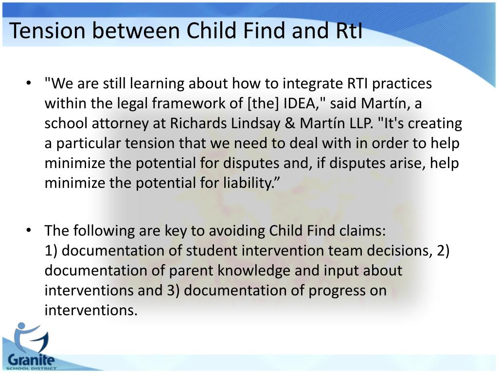 Tension between Child Find and RtI • "We are still learning about how to integrate RTI practices within the legal framework of [the] IDEA," said Martín, a school attorney at Richards Lindsay & Martín LLP. "It's creating a particular tension that we need to deal with in order to help minimize the potential for disputes and, if disputes arise, help minimize the potential for liability.” • The following are key to avoiding Child Find claims: 1) documentation of student intervention team decisions, 2) documentation of parent knowledge and input about interventions and 3) documentation of progress on interventions.
