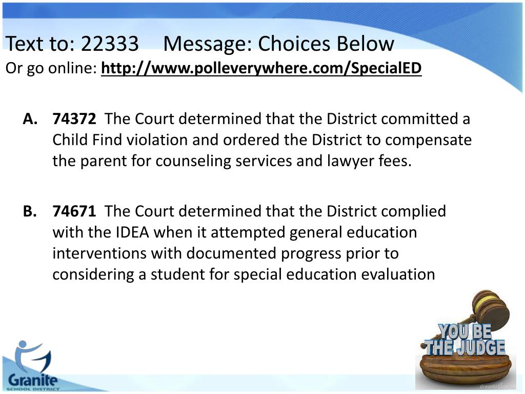 Text to: 22333Message: Choices Below Or go online: http://www.polleverywhere.com/SpecialED 74372 The Court determined that the District committed a Child Find violation and ordered the District to compensate the parent for counseling services and lawyer fees. 74671 The Court determined that the District complied with the IDEA when it attempted general education interventions with documented progress prior to considering a student for special education evaluation