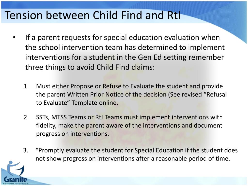 Tension between Child Find and RtI • If a parent requests for special education evaluation when the school intervention team has determined to implement interventions for a student in the Gen Ed setting remember three things to avoid Child Find claims: • Must either Propose or Refuse to Evaluate the student and provide the parent Written Prior Notice of the decision (See revised “Refusal to Evaluate” Template online. • SSTs, MTSS Teams or RtI Teams must implement interventions with fidelity, make the parent aware of the interventions and document progress on interventions. • “Promptly evaluate the student for Special Education if the student does not show progress on interventions after a reasonable period of time.