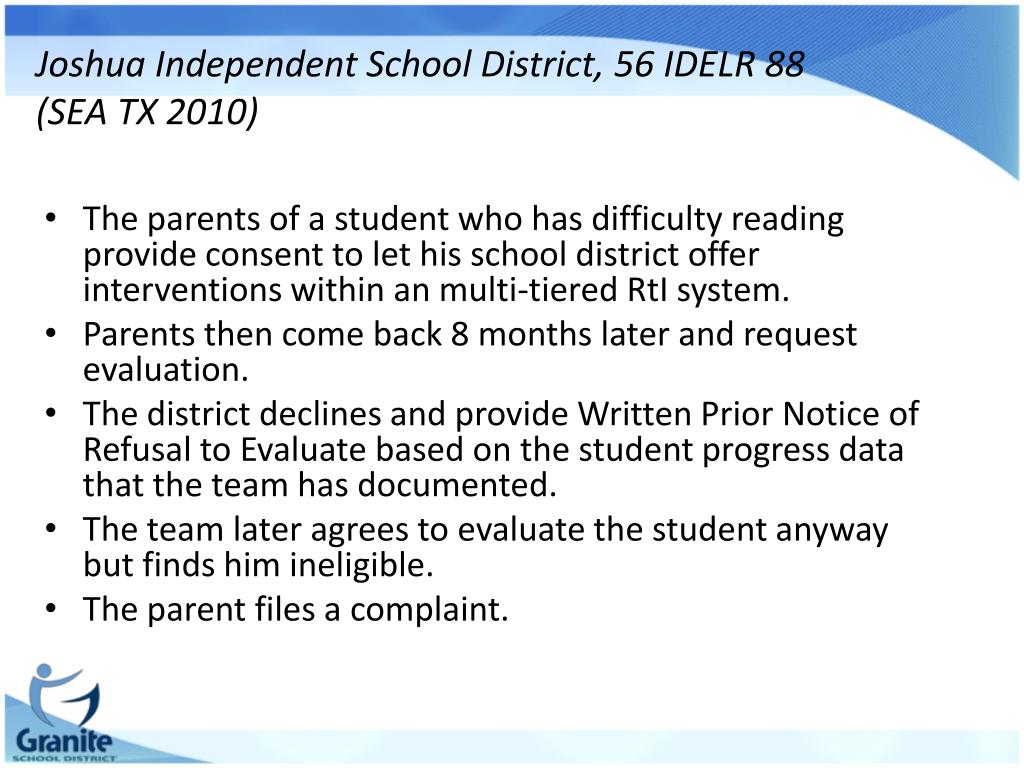 Joshua Independent School District, 56 IDELR 88 (SEA TX 2010) • The parents of a student who has difficulty reading provide consent to let his school district offer interventions within an multi-tiered RtI system. • Parents then come back 8 months later and request evaluation. • The district declines and provide Written Prior Notice of Refusal to Evaluate based on the student progress data that the team has documented. • The team later agrees to evaluate the student anyway but finds him ineligible. • The parent files a complaint.