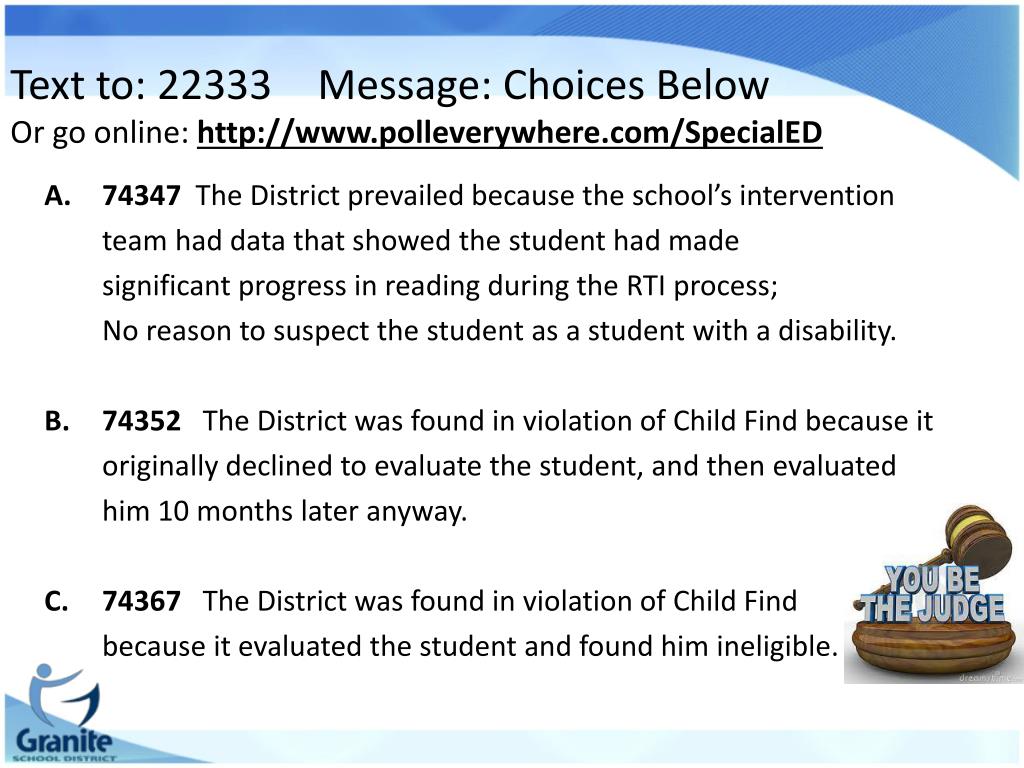 Text to: 22333Message: Choices Below Or go online: http://www.polleverywhere.com/SpecialED 74347 The District prevailed because the school’s intervention team had data that showed the student had made significant progress in reading during the RTI process; No reason to suspect the student as a student with a disability. 74352 The District was found in violation of Child Find because it originally declined to evaluate the student, and then evaluated him 10 months later anyway. 74367 The District was found in violation of Child Find because it evaluated the student and found him ineligible.