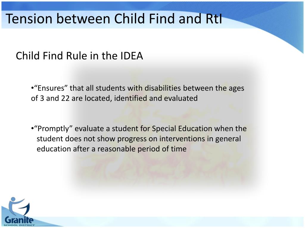 Tension between Child Find and RtI Child Find Rule in the IDEA • “Ensures” that all students with disabilities between the ages of 3 and 22 are located, identified and evaluated • “Promptly” evaluate a student for Special Education when the • student does not show progress on interventions in general • education after a reasonable period of time