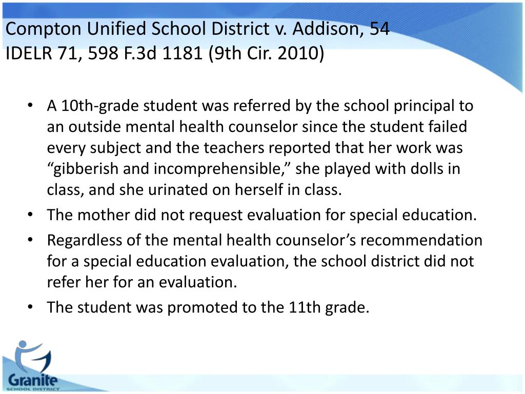 Compton Unified School District v. Addison, 54 IDELR 71, 598 F.3d 1181 (9th Cir. 2010) • A 10th-grade student was referred by the school principal to an outside mental health counselor since the student failed every subject and the teachers reported that her work was “gibberish and incomprehensible,” she played with dolls in class, and she urinated on herself in class. • The mother did not request evaluation for special education. • Regardless of the mental health counselor’s recommendation for a special education evaluation, the school district did not refer her for an evaluation. • The student was promoted to the 11th grade.