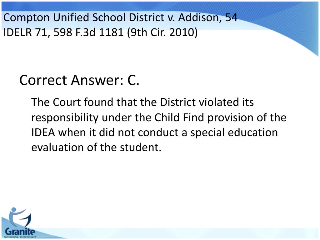 Compton Unified School District v. Addison, 54 IDELR 71, 598 F.3d 1181 (9th Cir. 2010) Correct Answer: C. The Court found that the District violated its responsibility under the Child Find provision of the IDEA when it did not conduct a special education evaluation of the student.