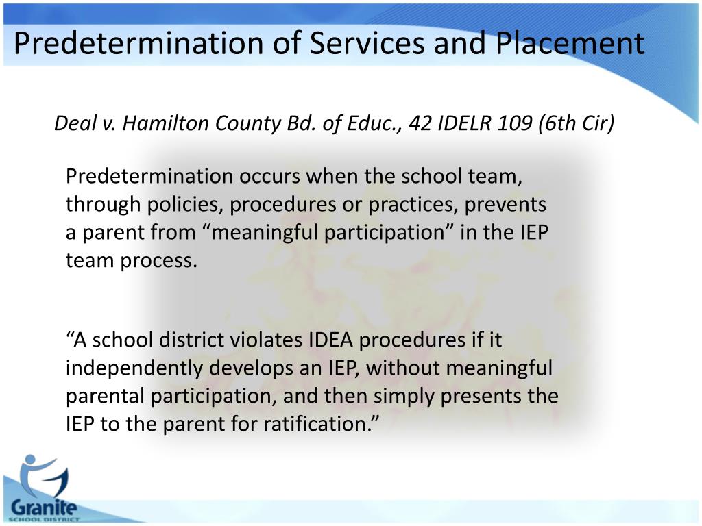 Predetermination of Services and Placement Deal v. Hamilton County Bd. of Educ., 42 IDELR 109 (6th Cir) Predetermination occurs when the school team, through policies, procedures or practices, prevents a parent from “meaningful participation” in the IEP team process. “A school district violates IDEA procedures if it independently develops an IEP, without meaningful parental participation, and then simply presents the IEP to the parent for ratification.”