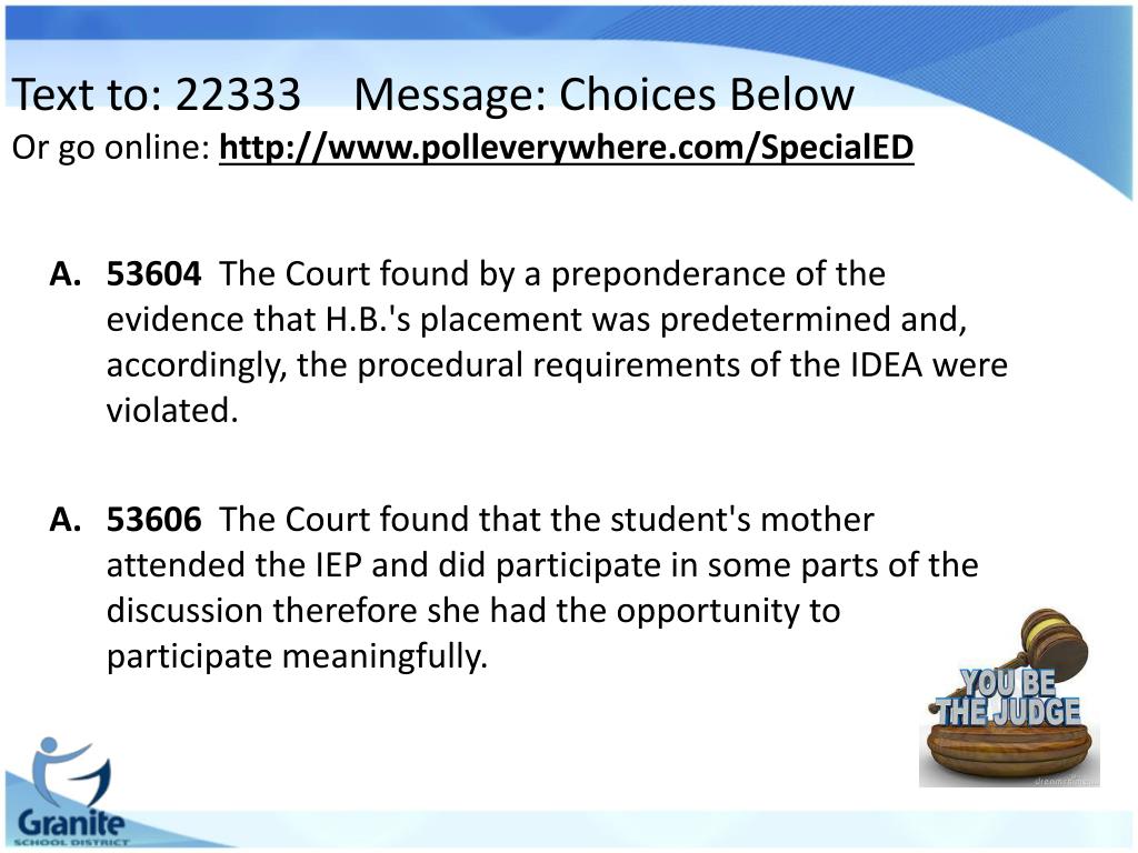 Text to: 22333Message: Choices Below Or go online: http://www.polleverywhere.com/SpecialED 53604 The Court found by a preponderance of the evidence that H.B.'s placement was predetermined and, accordingly, the procedural requirements of the IDEA were violated. 53606 The Court found that the student's mother attended the IEP and did participate in some parts of the discussion therefore she had the opportunity to participate meaningfully.