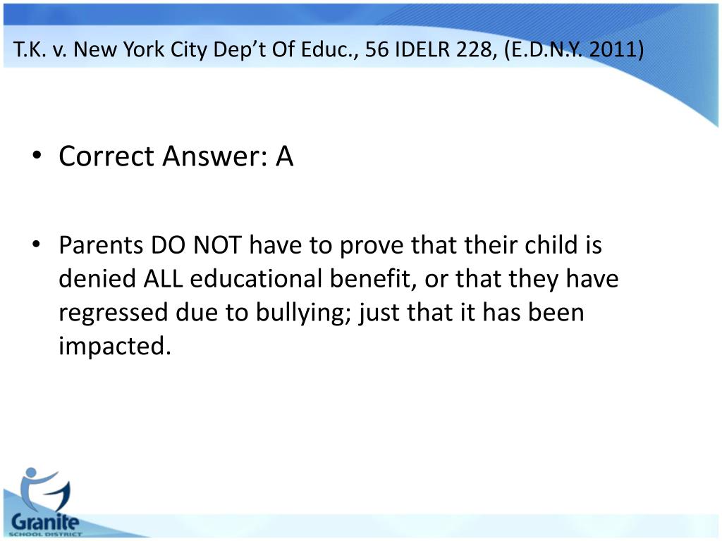 T.K. v. New York City Dep’t Of Educ., 56 IDELR 228, (E.D.N.Y. 2011) • Correct Answer: A • Parents DO NOT have to prove that their child is denied ALL educational benefit, or that they have regressed due to bullying; just that it has been impacted.