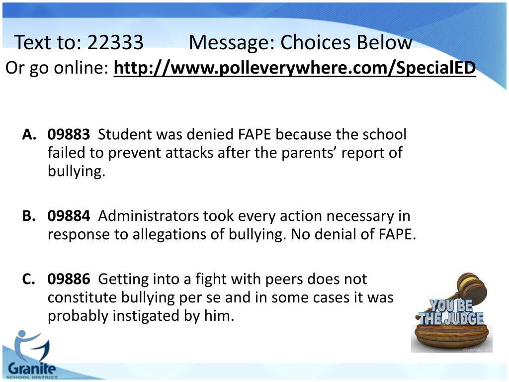 Text to: 22333Message: Choices Below Or go online: http://www.polleverywhere.com/SpecialED 09883 Student was denied FAPE because the school failed to prevent attacks after the parents’ report of bullying. 09884 Administrators took every action necessary in response to allegations of bullying. No denial of FAPE. 09886 Getting into a fight with peers does not constitute bullying per se and in some cases it was probably instigated by him.