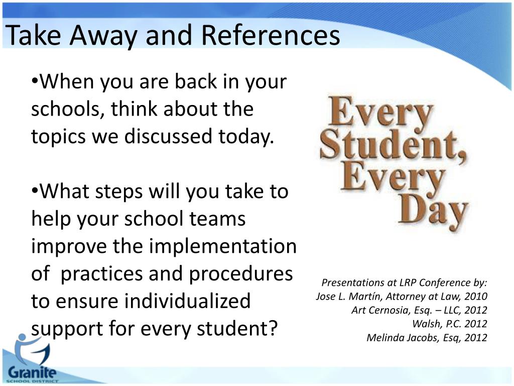 Take Away and References • When you are back in your schools, think about the topics we discussed today. • What steps will you take to help your school teams improve the implementation of practices and procedures to ensure individualized support for every student? Presentations at LRP Conference by: Jose L. Martín, Attorney at Law, 2010 Art Cernosia, Esq. – LLC, 2012 Walsh, P.C. 2012 Melinda Jacobs, Esq, 2012