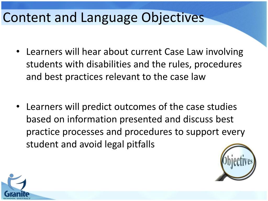 Content and Language Objectives • Learners will hear about current Case Law involving students with disabilities and the rules, procedures and best practices relevant to the case law • Learners will predict outcomes of the case studies based on information presented and discuss best practice processes and procedures to support every student and avoid legal pitfalls